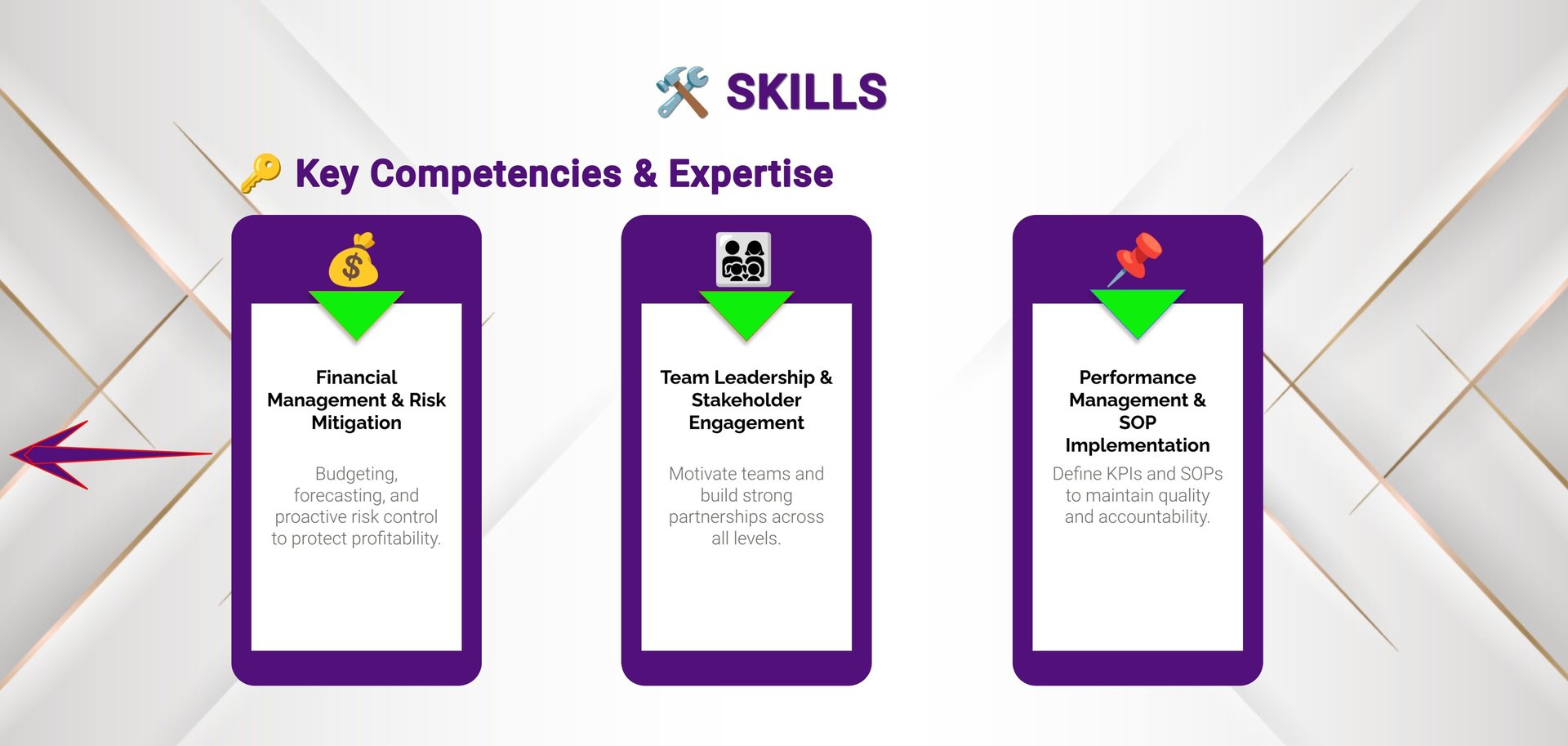 Skilled in setting KPIs, monitoring outcomes, and standardizing processes to ensure consistency and excellence.